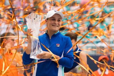 March 30, 2019March 30, 2019 William Eaton Ashleigh Barty, with trophy and streamers, 2019 Miami Open (photo from wtatennis dot com)